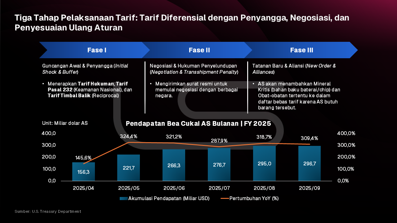 Fakta di lapangan, setelah inisiasi tarif ini diberlakukan Trump, pendapatan bea cukai AS melonjak drastis, dengan pertumbuhan YoY mencapai >300% dibulan-bulan awal TA 2025 (April-Juni).