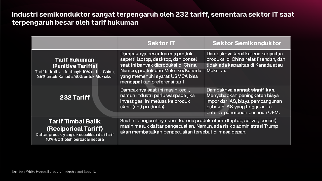 Berdasarkan dua alasan: Taiwan sebagai pusat produksi chip mutakhir dan Taiwan sebagai tempat banyak perusahaan OEM & ODM, maka kebijakan tariff Trump di sektor semikonduktor dan ICT sangat mempengaruhi stabilitas ekonomi & rantai pasok teknologi Taiwan. Contoh: dengan diberlakukan kebijakan tarif, perusahaan-perusahaan Taiwan didesak untuk memeriksa kembali perencanaan kapasitas mereka, mulai dari distribusi lokasi hingga evaluasi relokasi tempat produksi.