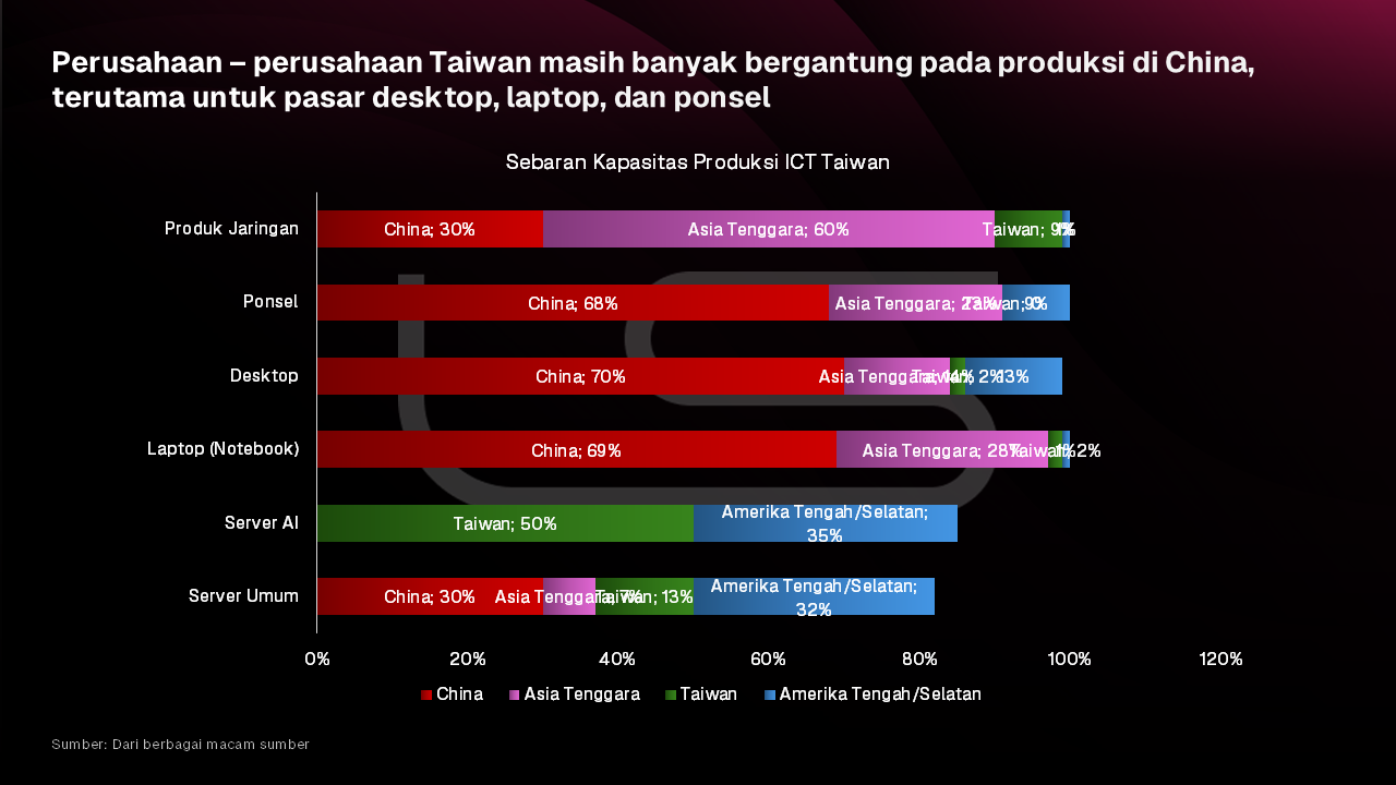 Melihat peta produksi dari perusahaan – perusahaan Taiwan, sebagian besar produksi produk ICT masih dilakukan di China, sebut saja seperti desktop yang mana produksinya 70% masih mengandalkan manufaktur China, tidak hanya itu laptop juga 69% produksinya masih di China, dan juga ponsel yang 68% produksinya masih di China.