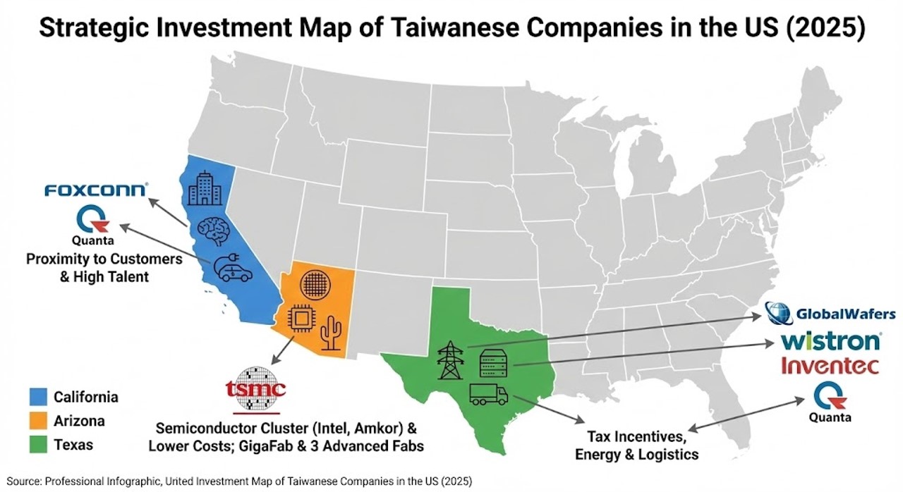 Texas sebagai negara bagian terbesar kedua di Amerika Serikat, juga dipilih oleh perusahaan – perusahaan asal Taiwan: GlobalWafers ($4 miliar), Wistron ($460 juta), dan Inventec ($85 juta) sebagai tempat investasi mereka, karena mengingat ketersediaan energi serta insentif pajak yang menarik.